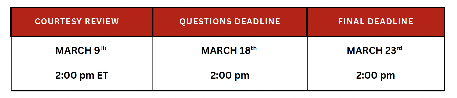 All applications must be submitted by March 23, 2026, at 2:00 pm Eastern Time (“ET”). No Exceptions.There are other deadlines that applicants should monitor.